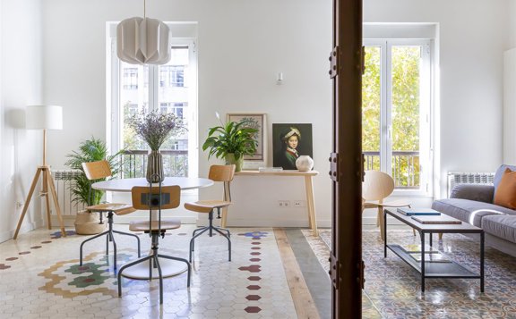 En viviendas con los suelos de baldosa hidráulica original, a la interiorista le gusta mantenerlos. “Tiene que haber un trabajo de recuperación”, advierte. “Primero hay que pulirlo, decaparlo y quitarle todas las capas de suciedad y arañazos que pueda tener y a partir de ahí sellar ese poro y acabar el proceso con ceras. Yo recomiendo terminar con acabado mate que es más resistente y más auténtico y elegante que el brillante”, tal como explica.